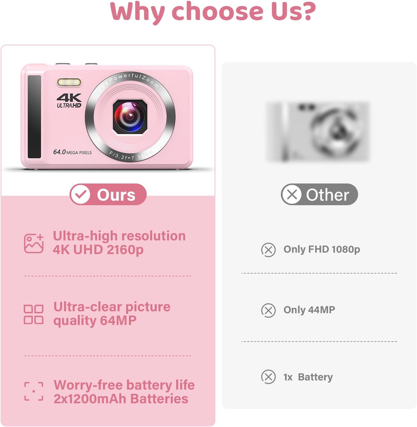 【64MP & 4K UHD Photography】Experience professional-grade image quality with this digital camera’s 64MP resolution and 4K UHD video recording. The advanced CMOS sensor delivers crisp, vibrant photos and videos with natural colors and fine details, eliminating the need for manual adjustments. Perfect for capturing memories, landscapes, or vlogs, this camera ensures every shot is stunning without complexity.