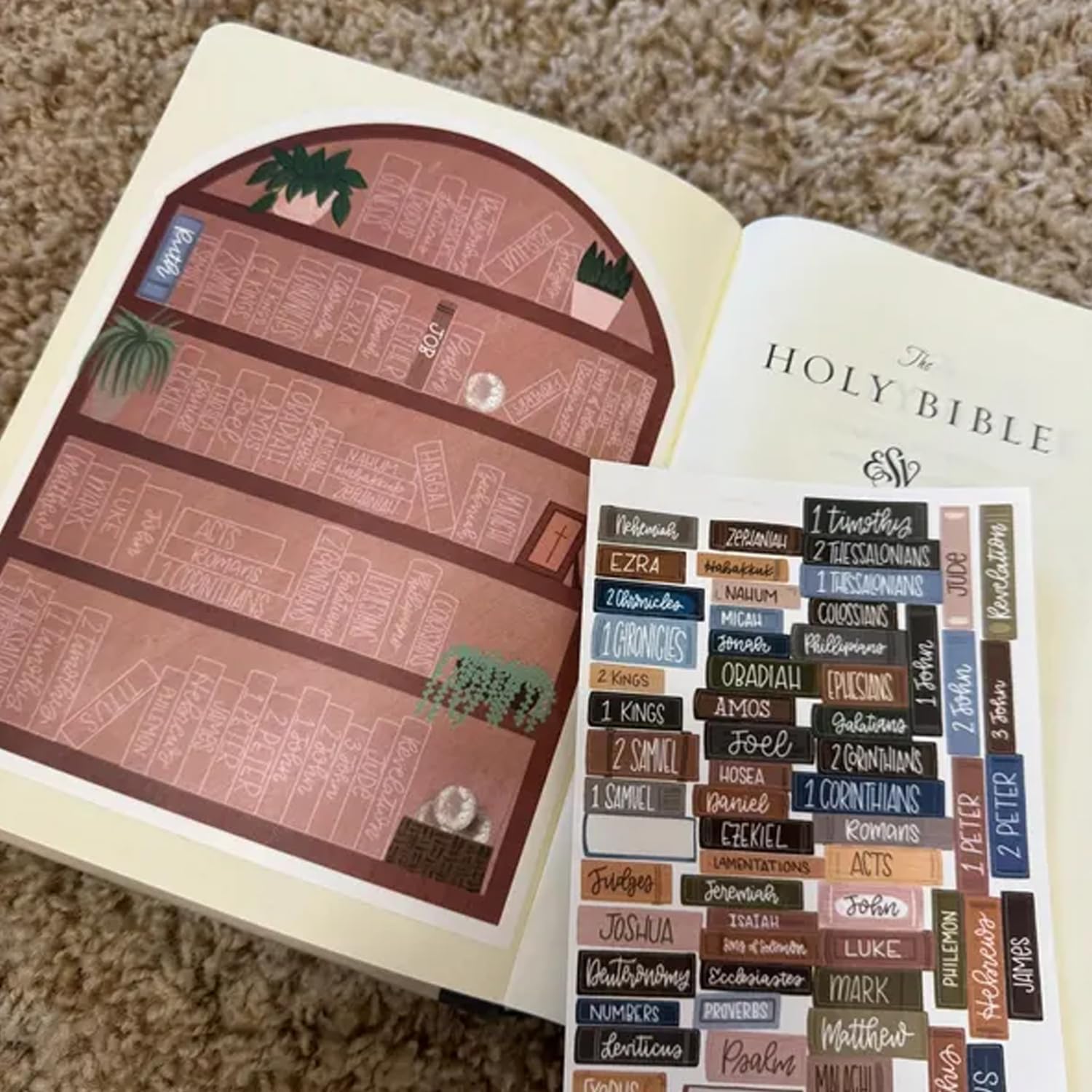 This creative bookshelf sticker will fit perfectly on flat book covers, smooth desk surfaces, and wooden bookshelves in your home. Whenever you finish reading a book in the Bible, just gently peel off the corresponding book sticker and stick it firmly on the “bookshelf”. It is especially recommended that you use it in your own Bible reading notebook, so that you can track your reading path clearly and visually while recording your reading insights