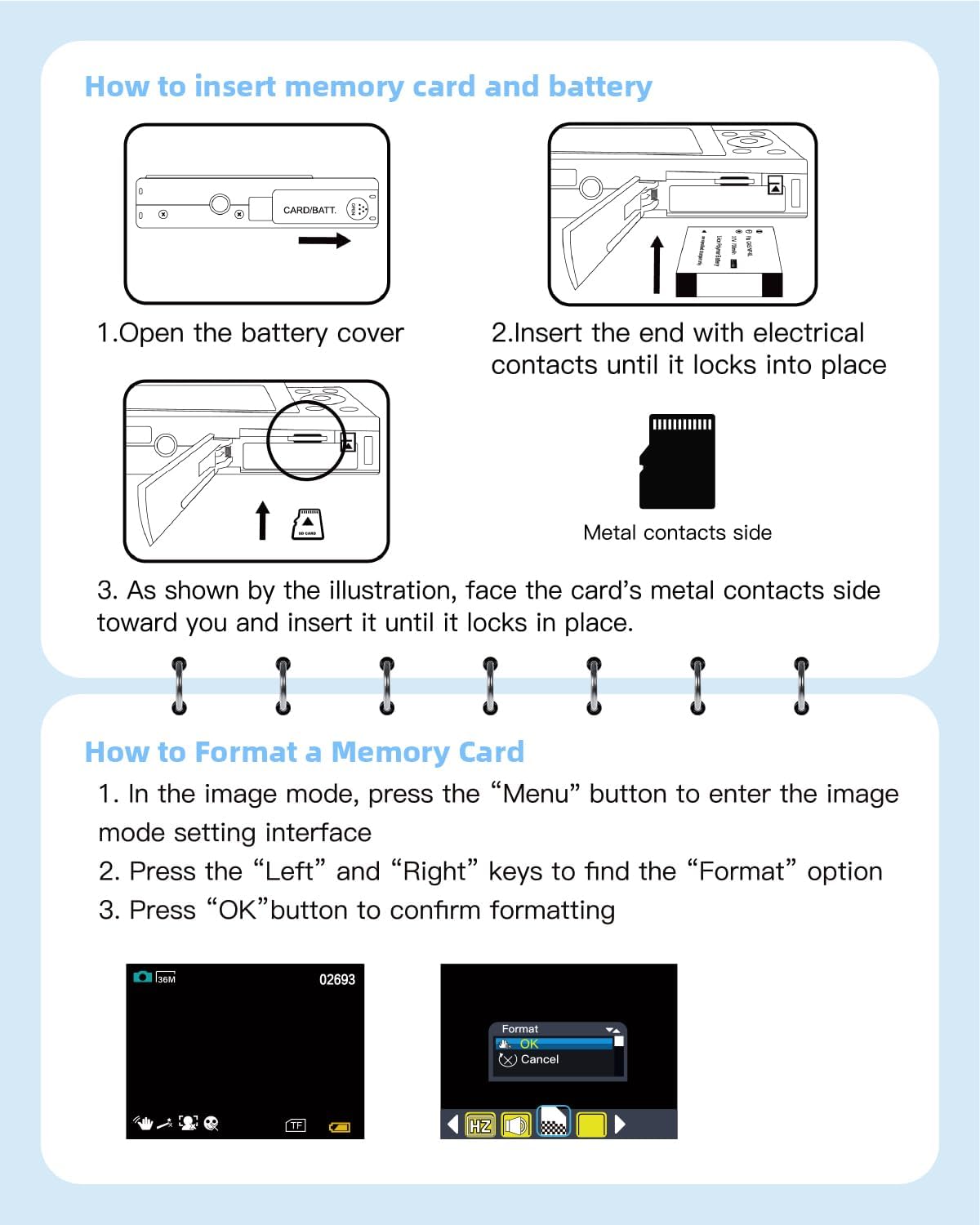 Color: White. Please make sure to insert the battery and memory card in the correct direction. And You need to format the memory card the first time using.