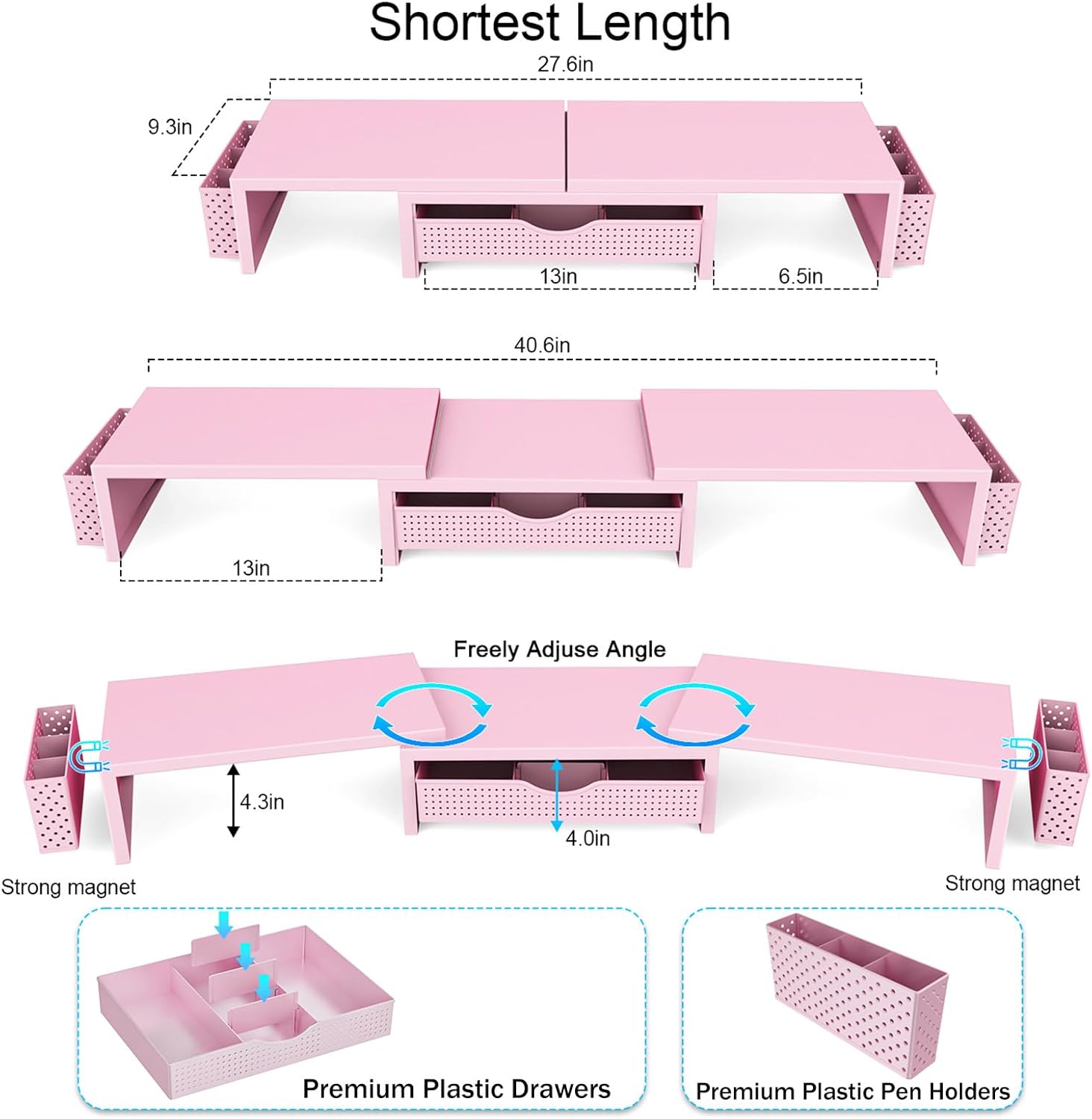 【Ample Storage Space】The dual monitor stand features two magnetic pen holders and a drawer, allowing you to easily organize your desk accessories and office supplies, keeping your workspace clear and tidy for easier access.