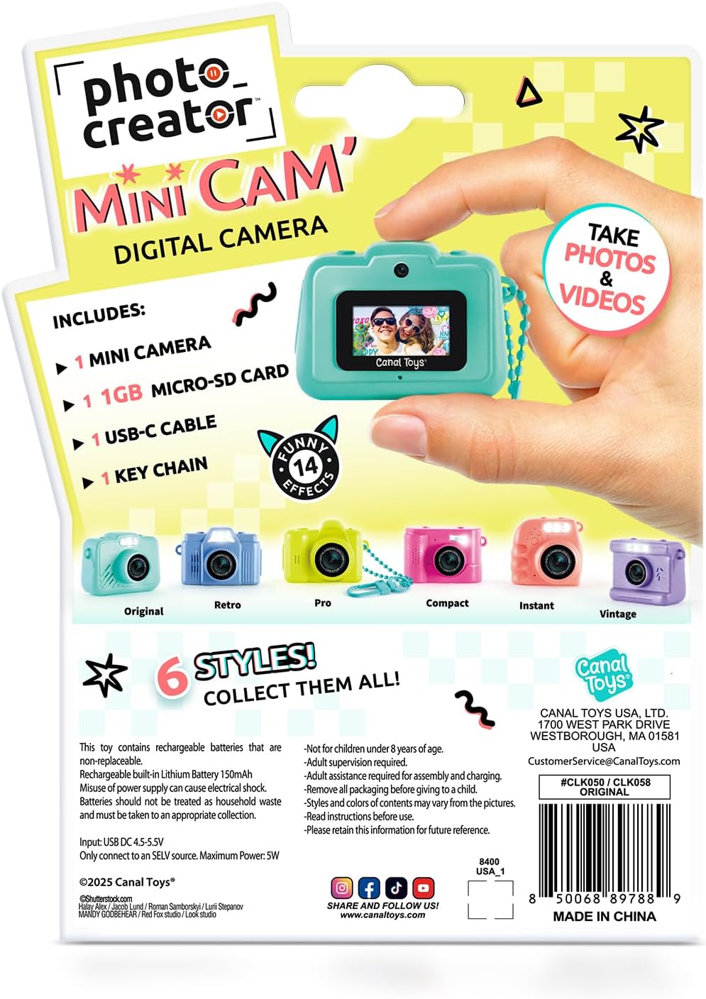 Hours of fun and creativity to discover among 6 models of ultra-trendy Mini’Cam! Ideal for capturing everyday moments, this mini digital camera allows you to customize photos and videos with 6 frames and 8 built-in color filters. Ultra-compact, it fits easily into a pocket or hangs on a bag thanks to its practical key ring. Comes with a 1GB micro-SD card to keep your creations always at hand, and simply transfer them to a computer, tablet or other device via the included USB-C cable. Developed in France, this device is designed for children from 8 years old, in compliance with European toy standards. Its ergonomic shape and intuitive buttons allow for easy grip, ideal for everyday use. Package includes: 1 x Mini Digital Camera, 1 x Keyring, 1 x 1GB Micro SD Card, 1 x USB-C Charging Cable.